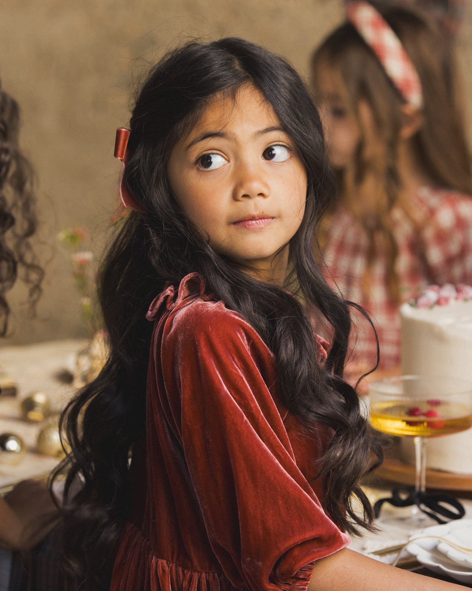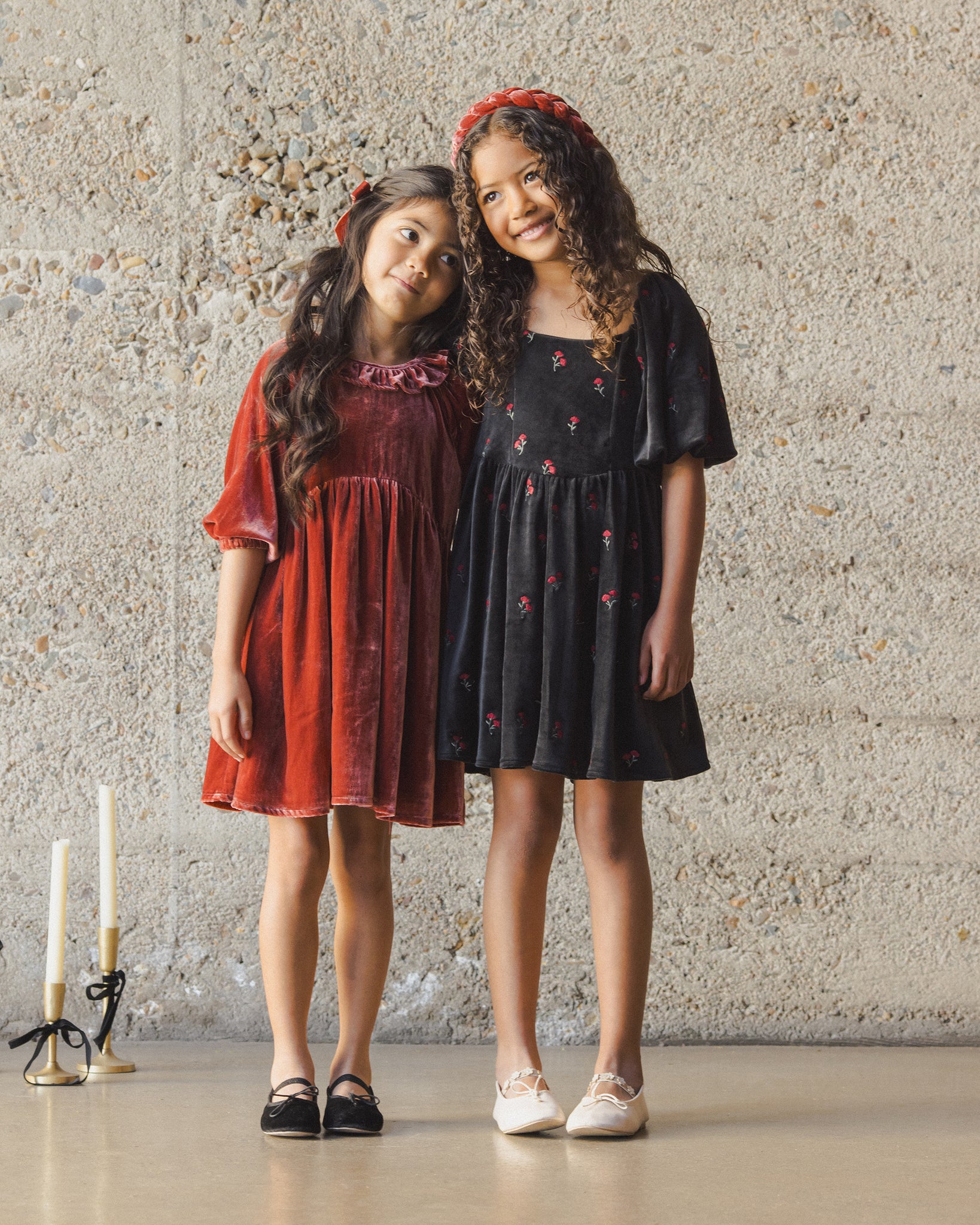 This sophisticated velvet dress features a sweet ruffle collar and voluminous balloon sleeves, complete with a zipper back closure. Coordinating bloomers included with size 12M-2Y.